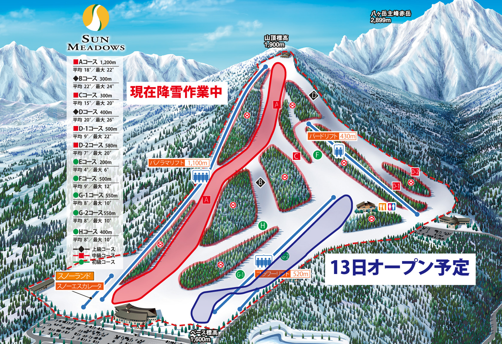 12/13(土)のオープン予定について 2025/12/11 13日はG2コースでオープンいたします。 Aコースは今後も降雪作業を続け準備ができ次第コースオープンいたします。 オープンコースに変更が出ましたら更新いたします。